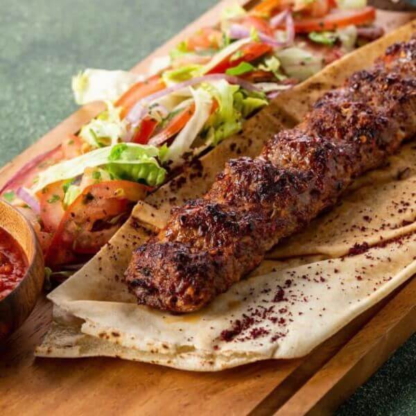 Tortilla Bread, Beef Adana, Olive Oil, Mixed Greens Salad, Sumac Powder